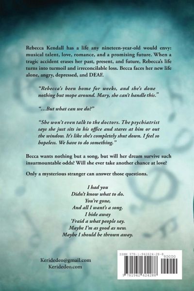 Rebecca Kendall has a life any nineteen-year-old would envy: musical talent, love, romance, and a promising future. When a tragic accident erases her past, present, and future, Rebecca's life turns into turmoil and irreconcilable loss. Becca faces her new life alone, angry, depressed, and DEAF. Becca wants nothing but a song, but will her dream survive such insurmountable odds? Will she ever take another chance at love? Only a mysterious stranger can answer those questions.