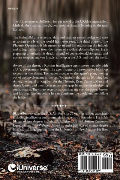 The U. S. government believes it has put an end to the Al Qaida organization. Little do they realize, though, how another threat is looming on the near horizon. The brainchild of a secretive, rich, and ruthless power broker will take terrorism to a level the world has never seen. The third phase of the Phoenix Operation is his means to an end for eradicating the infidels and ruling the world from the throne of a radical global caliphate. He is preparing to unleash his deadly arsenal of conventional, biological, and nuclear weapons and vast jihadist army upon the U. S., and then the world. Aware of the threat, a Russian intelligence agent meets secretly with a U. S. government leader. The agent suggests a provocative black op to counter the threat. The leader accedes to the agent's plan, bowing out of any involvement in the op. Not entirely, though. In Nothing but Ashes, the sequel to Requiem for the Phoenix, Ryan Daniels, Matt and Annie Garret, and their forces return to engage in another death-defying confrontation. They must secretly vanquish at any cost the power broker and his organization before he can dominate the world and annihilate the infidels.