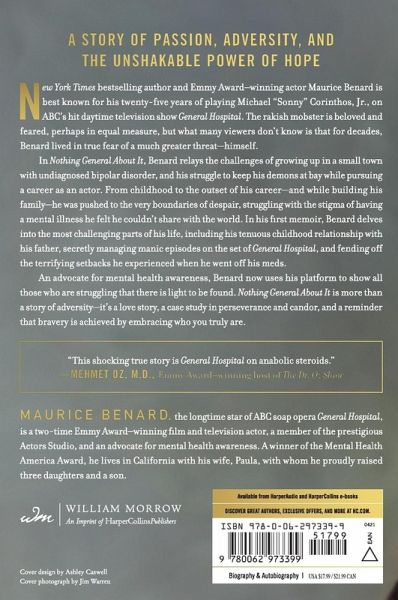 Instant New York Times bestseller! The Emmy Award-winning star of General Hospital chronicles his astonishing and emotional life journey in this powerful memoir?an inspiring story of success, show business, and family, and his struggle with mental illness. "This shocking true story is General Hospital on anabolic steroids." ? Mehmet Oz, M.D., Emmy Award-winning host of The Dr. Oz Show Maurice Benard has been blessed with family, fame, and a successful career. For twenty-five years, he has played one of the most well-known characters on daytime television: General Hospital's Michael ?Sonny? Corinthos, Jr. In his life outside the screen, he is a loving husband and the father of four. But his path has not been without hardship. When he was only twenty, Maurice was diagnosed with bipolar disorder. In Nothing General About It, Maurice looks back to his youth in a small town and his tenuous relationship with his father. He describes how his bipolar disorder began to surface in childhood, how he struggled to understand the jolting mood swings he experienced, and how a doctor finally saved his life. For years Maurice was relentless in his goal to be a successful actor. But even after he ?made it,? he still grappled with terrifying lows, breakdowns, and setbacks, all while trying desperately to maintain his relationship with his wife, who endured his violent, unpredictable episodes. Maurice holds nothing back as he bravely talks about what it was like to be medicated and institutionalized, and of how he learned to manage his manic episodes while on the set of GH. Nothing General About It is also an incredible love story about an enduring marriage that demonstrates what those vows?for better, for worse, in sickness and in health?truly mean. Maurice also pays tribute to the community that has been there for him through thick and thin, and ruminates on the importance of both inherited and created family. A shocking, riveting, and utterly candid memoir of love, adversity, and ultimately hope, Nothing General About It offers insights and advice for everyone trying to cope with mental illness, and is a motivational story that offers lessons in perseverance?of the importance of believing in and fighting for yourself through the darkest times. Nothing General About It includes a 16-page insert featuring approximately 50 photographs.