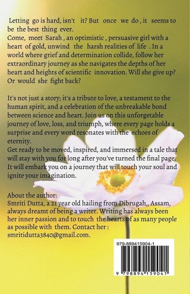Letting go is hard, isn't it? But once we do, it seems to be the best thing ever. Come, meet Sarah, an optimistic, persuasive girl with a heart of gold, unwind the harsh realities of life. In a world where grief and determinaton collide, follow her extraordinary journey as she navigates the depths of her heart and heights of scientific innovation. Will she give up? Or would she fight back? It's not just a story, it's a tribute to love, a testament to the human spirit, and a celebration of the unbreakable bond between science and heart. Join us, on this unforgetable journey of love, loss and triumph, where every page holds a surprise and every word resonates with the echoes of eternity. Get ready to be moved, inspired and immersed in a tale that will stay with you for long after you've turned the final page. It will embark you on a journey that will touch your soul and ignite your imagination.