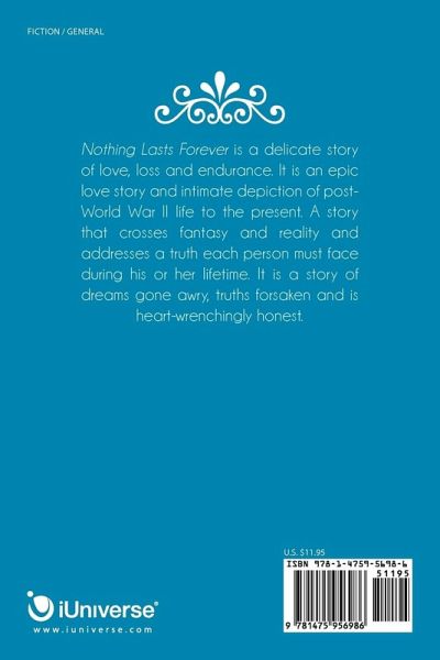 Nothing Lasts Foreveris a delicate story of love, loss and endurance. It is an epic love story and intimate depiction of post-World War II life to the present. A story that crosses fantasy and reality and addresses a truth each person must face during his or her lifetime. It is a story of dreams gone awry, truths forsaken and is heart-wrenchingly honest.