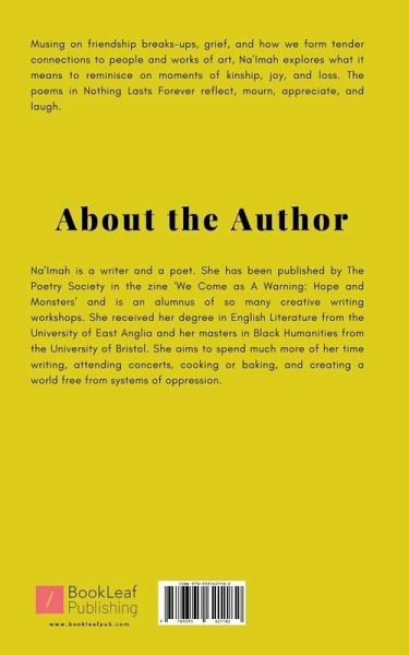 Musing on friendship breaks-ups, grief, and how we form tender connections to people and works of art, Na'Imah explores what it means to reminisce on moments of kinship, joy, and loss. The poems in Nothing Lasts Forever reflect, mourn, appreciate, and laugh.