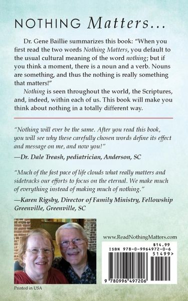 When you first read the two words Nothing Matters, you default to the usual cultural meaning of the word nothing; but if you think a moment, there is a noun and a verb. Nouns are something, and thus the nothing is really something that matters! Nothing is seen throughout the world, the Scriptures, and, indeed, within each of us. This book will make you think about nothing in a totally different way. It will challenge you to think about your life and its true purpose, so that you do not waste your nothing. You see, nothing truly does matter!