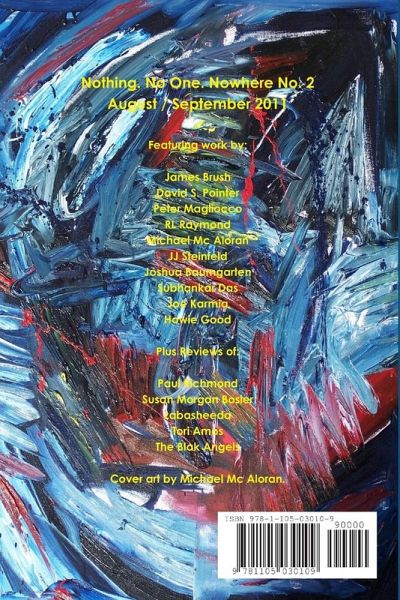 Nothing. No One. Nowhere. No. 2-- "The Belated" issue features work by James Brush, Michael Mc Aloran, Joe Karmia, Howie Good, David S. Pointer, Peter Magliocco, J.J. Steinfeld, R.L. Raymond, Subhankar Das, and Joshua Baumgarten. This second edition also has reviews of "...Ready or Not, Living in the Break Down Lane." by Paul Richmond and "Colloquy" by Susan Morgan Bosler. Music reviews of Labasheeda, Tori Amos and The Black Angels. Jam packed with an art spread by Michael Mc Aloran. Nothing. No One. Nowhere. not the average magazine. Edited by Amelia Hoff. VG 32.
