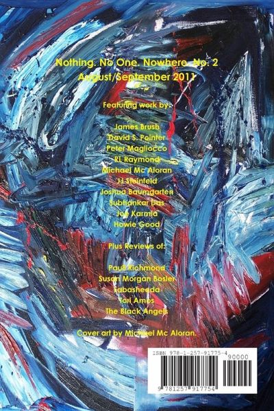 Nothing. No One. Nowhere. No. 2-- "The Belated" issue features work by James Brush, Michael Mc Aloran, Joe Karmia, Howie Good, David S. Pointer, Peter Magliocco, J.J. Steinfeld, R.L. Raymond, Subhankar Das, and Joshua Baumgarten. This second edition also has reviews of "...Ready or Not, Living in the Break Down Lane." by Paul Richmond and "Colloquy" by Susan Morgan Bosler. Music reviews of Labasheeda, Tori Amos and The Black Angels. Jam packed with an art spread by Michael Mc Aloran. Nothing. No One. Nowhere. not the average magazine. Edited by Amelia Hoff. VG 32.
