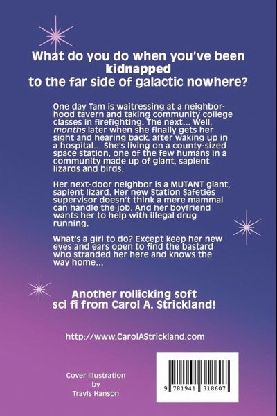Kidnapped to the far side of galactic nowhere! One day Tam is waitressing at a neighborhood tavern and taking community college classes in firefighting. The next... Well, months later when she finally gets her sight and hearing back, after waking up in a hospital... She's living on a county-sized space station, one of the few humans in a community made up of giant, sapient lizards and birds. Her next-door neighbor is a MUTANT giant, sapient lizard. Her new Station Safeties supervisor doesn't think a mere mammal can handle the job. And her boyfriend wants her to help with illegal drug running. What's a girl to do? Except keep her new eyes and ears open to find the bastard who stranded her here and knows the way home...