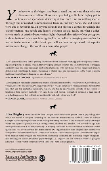 You have to be the biggest and best to stand out. At least, that's what our culture seems to believe. However, as psychologist Dr. Leia Hughey points out, we are all special and deserving of love, even if we are nothing special. Through the nonverbal communication from an ordinary horse, she and others were able to reveal unhealed psychic wounds and provide a context for change and transformation. Just people and horses. Nothing special, really, but what a difference it made. A pristine beauty exists slightly beneath the surface of our perception and can be found when love is recognized in the ordinary, enjoying one another for no particular reason. In this book, you will see how interpersonal, interspecies interactions changed the world for a handful of people.