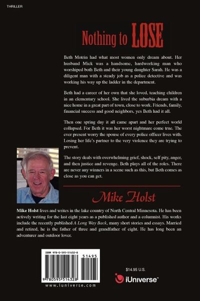 Beth Motrin had what most women only dream about. Her husband Mick was a handsome, hardworking man who worshiped both Beth and their young daughter Sarah. He was a diligent man with a steady job as a police detective and was working his way up the ladder in the department. Beth had a career of her own that she loved, teaching children in an elementary school. She lived the suburbia dream with a nice home in a great part of town, close to work. Friends, family, financial success and good neighbors, yes Beth had it all. Then one spring day it all came apart and her perfect world collapsed. For Beth it was her worst nightmare come true. The ever present worry the spouse of every police officer lives with. Losing her life's partner to the very violence they are trying to prevent. The story deals with over whelming grief, shock, self pity, anger, and then justice and revenge. Beth plays all of the roles. There are never any winners in a scene such as this, but Beth comes as close as you can get.