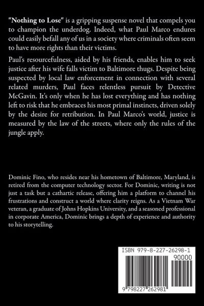 "Nothing to Lose" is a gripping suspense novel that compels you to champion the underdog. Indeed, what Paul Marco endures could easily befall any of us in a society where criminals often seem to have more rights than their victims. Paul's resourcefulness, aided by his friends, enables him to seek justice after his wife falls victim to Baltimore thugs. Despite being suspected by local law enforcement in connection with several related murders, Paul faces relentless pursuit by Detective McGavin. It's only when he has lost everything and has nothing left to risk that he embraces his most primal instincts, driven solely by the desire for retribution. In Paul Marco's world, justice is measured by the law of the streets, where only the rules of the jungle apply.