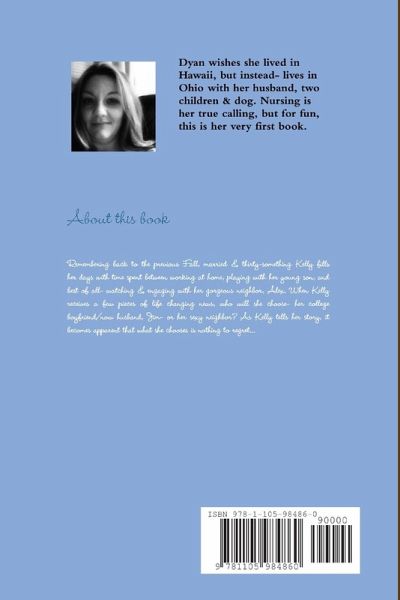 Remembering back to the previous fall, married & thirty-something Kelly fills her days with time spent between working at home, playing with her young son, and best of all- watching & engaging with her gorgeous neighbor, Alex. When Kelly receives a few pieces of life changing news, who will she choose- her college boyfriend/now husband, Jim- or her sexy neighbor? As Kelly tells her story, it becomes apparent that what she chooses is nothing to regret...