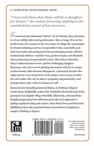 "I have told Rose that there will be a chauffeur for dinner," she ended, frowning slightly at the cannibalistic sound of her sentence. Unmarried and nicknamed "Button" by her friends, Mary Morrison is a (very mildly) distressed gentlewoman. She no longer lives in her family home, but remains at the very centre of village life, surrounded by friends including carefree, irresponsible Catha, Lady Rollo, just back from India and setting up lavish housekeeping nearby with her husband and children-socialist Tony, perfect Crispin, and Elizabeth who's preparing to be presented at Court. Then there's Marcelle, Mary's widowed sister-in-law, and her challenging daughter Rosemary, who may soon be planting themselves with her to escape London bombs, Miss Rosanna Masquerier, a historical novelist who might just be a wry self-portrait of the author, and an array of other Sirs and Ladies who rely on Mary's sympathy and practicality. And perhaps there's just a hint of romance as well . . . Known for her bestselling historical fiction, in Nothing to Report Carola Oman delightfully evokes E.M. Delafield's Provincial Lady in her portrayal of an English village cheerfully, hilariously, and sometimes bumpily progressing from obliviousness to the war's approach to pulling together for king and country. Dean Street Press and Furrowed Middlebrow have also reprinted Oman's Somewhere in England, a sequel to Nothing to Report.