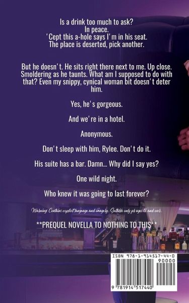 Steamy One-Night Stand Billionaire Prequel Novella Is a drink too much to ask? In peace. 'Cept this a-hole says I'm in his seat. The place is deserted, pick another. But he doesn't. He sits right there next to me. Up close. Smoldering as he taunts. What am I supposed to do with that? Even my snippy, cynical woman bit doesn't deter him. Yes, he's gorgeous. And we're in a hotel. Anonymous. Don't sleep with him, Rylee. Don't do it. His suite has a bar. Damn... Why did I say yes? One wild night. Who knew it was going to last forever? Warning: Contains explicit language and imagery. Suitable only for ages 18 and over. **PREQUEL NOVELLA TO NOTHING TO THIS**