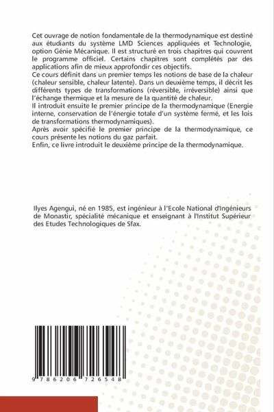 Cet ouvrage de notion fondamentale de la thermodynamique est destiné aux étudiants du système LMD Sciences appliquées et Technologie, option Génie Mécanique. Il est structuré en trois chapitres qui couvrent le programme officiel. Certains chapitres sont complétés par des applications afin de mieux approfondir ces objectifs.Ce cours définit dans un premier temps les notions de base de la chaleur (chaleur sensible, chaleur latente). Dans un deuxième temps, il décrit les différents types de transformations (réversible, irréversible) ainsi que l'échange thermique et la mesure de la quantité de chaleur.Il introduit ensuite le premier principe de la thermodynamique (Energie interne, conservation de l'énergie totale d'un système fermé, et les lois de transformations thermodynamiques).Après avoir spécifié le premier principe de la thermodynamique, ce cours présente les notions du gaz parfait.Enfin, ce livre introduit le deuxième principe de la thermodynamique.