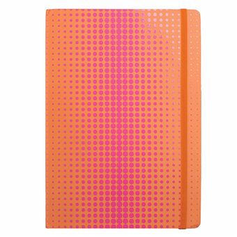 Notizbuch im Format A4 aus fein gestrichenem 80 g/m² Papier. Der Einband ist aus stabilem Karton, matt laminiert, mit abgerundeten Ecken und mit partieller Lackierung. Buchblock mit Fadenheftung. Die 224 Seiten sind beidseitig mit dezent gepunkteten Linien bedruckt. Extras: farbige Coverinnenseiten, Faltinnentasche hinten zum Aufbewahren und ein gewebtes Gummiband zum Verschließen.