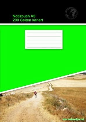 Ein Notizbuch in der gängigen Größe A5 mit 200 karierten Seiten (100 Blatt). Es handelt sich um einen Merchandise-Artikel von www.weltenpilger.net und ist in der Grundfarbe Grün gehalten. Der obere Rand ist schwarz und das Titelbild zeigt einen Wanderer durch die spanische Meseta auf dem Jakobsweg. Es handelt sich um ein Softcover (Taschenbuch), das ideal für Schule und Beruf ist.