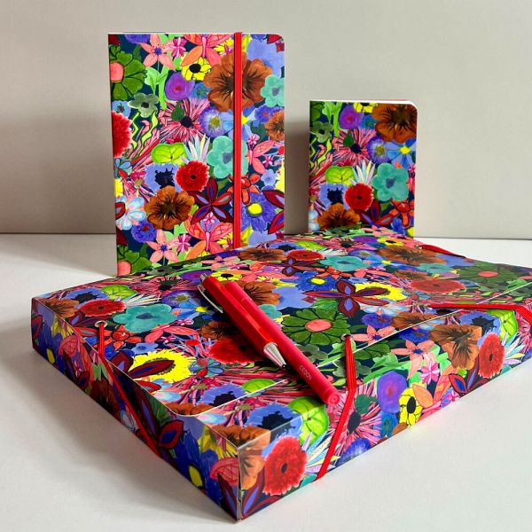 Notizbuch im Format A5 aus fein gestrichenem 80 g/m² Papier. Der Einband ist aus stabilem Karton, matt laminiert, mit abgerundeten Ecken. Buchblock mit Fadenheftung. Die 192 Seiten sind beidseitig mit dezent gepunkteten Linien bedruckt. Extras: farbige Coverinnenseiten, Faltinnentasche hinten zum Aufbewahren und ein gewebtes Gummiband zum Verschließen.
