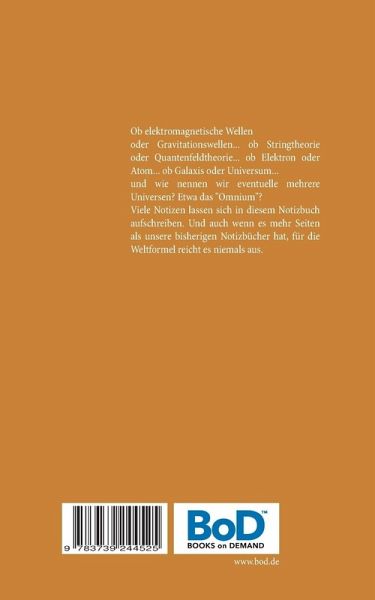 Ob elektromagnetische Wellen oder Gravitationswellen... ob Stringtheorie oder Quantenfeldtheorie... ob Elektron oder Atom... ob Galaxis oder Universum... und wie nennen wir eventuelle mehrere Universen? Etwa das "Omnium"? Viele Notizen lassen sich in diesem Notizbuch aufschreiben. Und auch wenn es mehr Seiten als unsere bisherigen Notizbücher hat, für die Weltformel reicht es niemals aus.