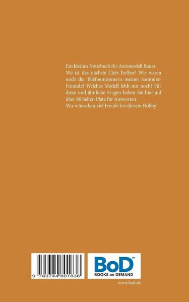 Ein kleines Notizbuch für Automodell-Bauer. Wo ist das nächste Club-Treffen? Wie waren noch die Telefonnummern meiner Sammler-Freunde? Welches Modell fehlt mir noch? Für diese und ähnliche Fragen haben Sie hier auf über 80 Seiten Platz für Antworten.Wir wünschen viel Freude bei diesem Hobby!