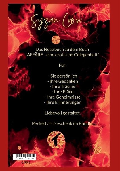 Zu jedem Buch von Syzan Crow erscheint ein Notizbuch im passenden Cover-Design. Das Notizbuch zu dem Buch "AFFÄRE - eine erotische Gelegenheit". Für: - Sie persönlich - Ihre Gedanken - Ihre Träume - Ihre Pläne - Ihre Geheimnisse - Ihre Erinnerungen Liebevoll gestaltet. Perfekt als Geschenk im Bundle.