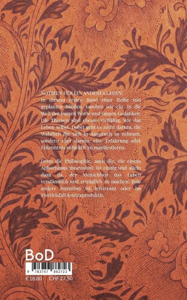 NOTIZEN FÜR EIN ANDERES LEBEN: In diesem ersten Band einer Reihe von geplanten Bänden, tauchen wir ein, in die Welt der kurzen Worte und langen Gedanken. Die Themen sind ebenso vielfältig, wie das Leben selbst. Dabei geht es nicht darum, die Wahrheit für sich in Anspruch zu nehmen, sondern eher darum, eine Erfahrung oder Erkenntnis subjektiv zu manifestieren. Denn die Philosophie, auch die, die einem Aphorismus innewohnt, ist einzig und allein dazu da, der Menschheit das Leben verständlich und erträglich zu machen. Jede andere Intention ist irrelveant oder im Zweifelsfall kontraproduktiv.
