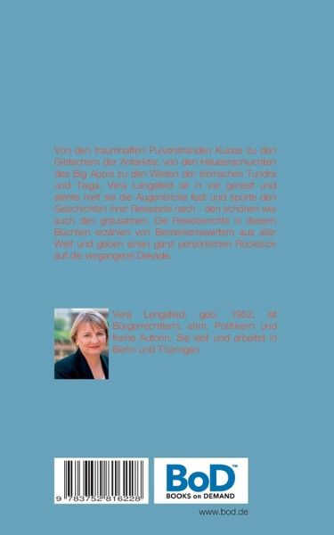 Von den traumhaften Pulverstränden Kubas zu den Gletschern der Antarktis; von den Häuserschluchten des Big Apple zu den Weiten der sibirischen Tundra und Taiga. Vera Lengsfeld ist in viel gereist und stehts hielt sie die Augenblicke fest und spürte den Geschichten ihrer Reisezeile nach - den schönen wie auch den grausamen. Die Reiseberichte in diesem Büchlein erzählen von Bemerkenswertem aus aller Welt und geben einen ganz persönlichen Rückblick auf die vergangene Dekade.