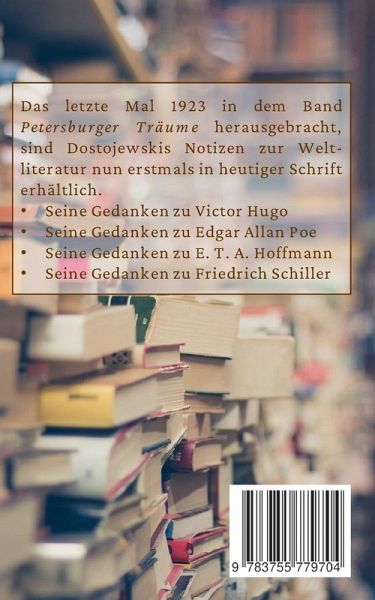 Inhalt:Gedanken zu Victor HugoGedanken zu Edgar Allan PoeGedanken zu E. T. A. HoffmannGedanken zu Friedrich SchillerOriginalDostojewski, F. M. (1861): Notizen zur Weltliteratur. In: Petersburger Träume. München: R. Piper und Co. 1923: S. 149-158.Autor: Fjodor Michailowitsch Dostojewski (1821-1881)Übersetzung: Alexander Eliasberg (1879-1924)Herausgegeben und kommentiert: Pascal Heberlein (2022)