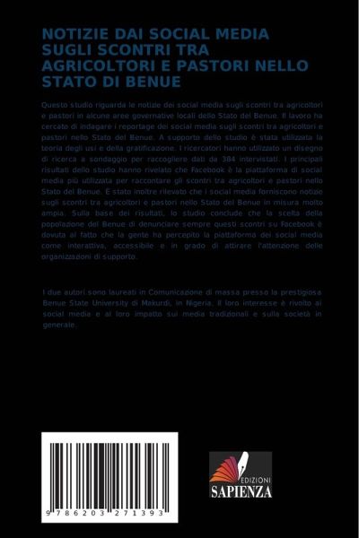 Questo studio riguarda le notizie dei social media sugli scontri tra agricoltori e pastori in alcune aree governative locali dello Stato del Benue. Il lavoro ha cercato di indagare i reportage dei social media sugli scontri tra agricoltori e pastori nello Stato del Benue. A supporto dello studio è stata utilizzata la teoria degli usi e della gratificazione. I ricercatori hanno utilizzato un disegno di ricerca a sondaggio per raccogliere dati da 384 intervistati. I principali risultati dello studio hanno rivelato che Facebook è la piattaforma di social media più utilizzata per raccontare gli scontri tra agricoltori e pastori nello Stato del Benue. È stato inoltre rilevato che i social media forniscono notizie sugli scontri tra agricoltori e pastori nello Stato del Benue in misura molto ampia. Sulla base dei risultati, lo studio conclude che la scelta della popolazione del Benue di denunciare sempre questi scontri su Facebook è dovuta al fatto che la gente ha percepito la piattaforma dei social media come interattiva, accessibile e in grado di attirare l'attenzione delle organizzazioni di supporto.