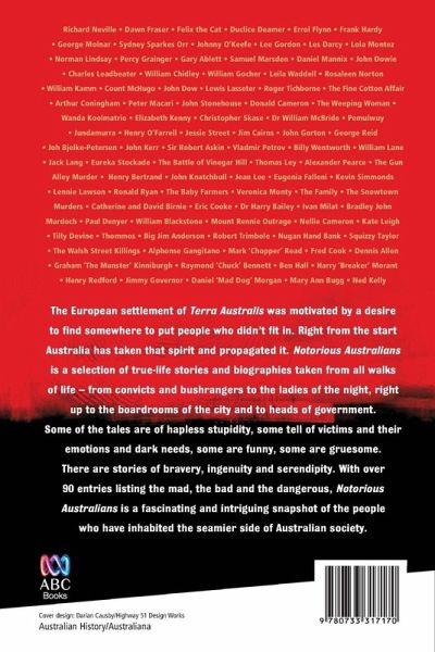 the European settlement of terra Australis was motivated by a desire to find somewhere to put people who didn t fit in. Right from the start Australia has taken that spirit and propagated it. NOtORIOUS AUStRALIANS is a selection of true life stories and biographies taken from all walks of life - from convicts and bushrangers to the ladies of the night, right up to the boardrooms of the city and to heads of government. Some of the tales are of hapless stupidity, some tell of victims and their emotions and dark needs, some are funny, some are gruesome. there are stories of bravery, ingenuity and serendipity. A quirky and entertaining reference book on Australia's infamous personalities.