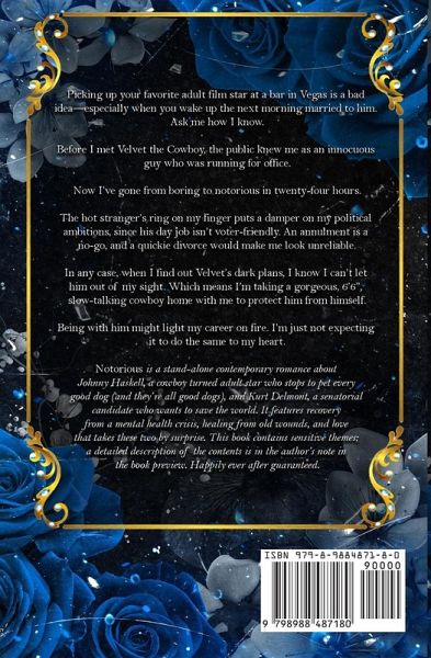 Picking up your favorite adult film star at a bar in Vegas is a bad idea-especially when you wake up the next morning married to him. Ask me how I know. Before I met Velvet the Cowboy, the public knew me as an innocuous guy who was running for office. Now I've gone from boring to notorious in twenty-four hours. The hot stranger's ring on my finger puts a damper on my political ambitions, since his day job isn't voter-friendly. An annulment is a no-go, and a quickie divorce would make me look unreliable. In any case, when I find out Velvet's dark plans, I know I can't let him out of my sight. Which means I'm taking a gorgeous, 6'6", slow-talking cowboy home with me to protect him from himself. Being with him might light my career on fire. I'm just not expecting it to do the same to my heart. Notorious is a stand-alone contemporary romance about Johnny Haskell, a cowboy turned adult star who stops to pet every good dog (and they're all good dogs), and Kurt Delmont, a senatorial candidate who wants to save the world. It features recovery from a mental health crisis, healing from old wounds, and love that takes these two by surprise. This book contains sensitive themes; a detailed description of the contents is in the author's note in the book preview. Happily ever after guaranteed.