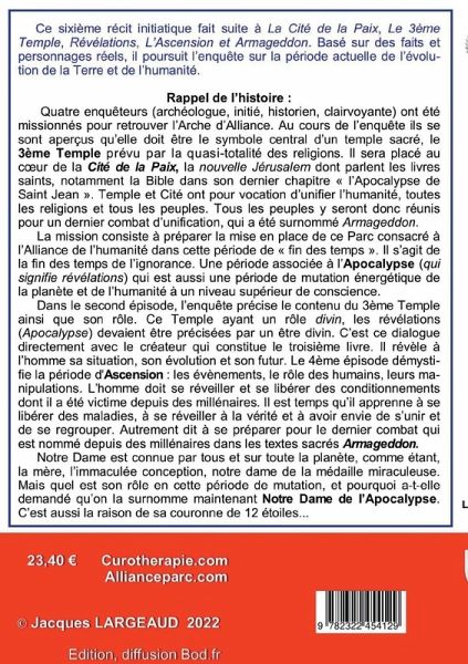 Ce roman initiatique numéro 6 fait suite à la Cité de la Paix - le 3ème temple - Révélations (apocalypse) - l'Ascension et Armageddon. En cette période d'évolution de la Terre, Notre Dame, connu de partout et de toute époque porte le nom de Notre Dame de l'Apocalypse. Vous comprendrez pourquoi et quel est son rôle actuellement.