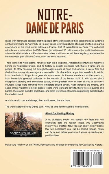 If you want to discover the captivating history of Notre-Dame de Paris, then keep reading... It was with horror and sadness that the people of the world opened their social media or switched on their televisions on April 15th, 2019, only to see terrifying pictures of smoke and flames roaring around one of the most iconic outlines in France: that of Notre-Dame de Paris. The cathedral attracts more visitors than the Eiffel Tower (an estimated 13 million annually), and it has become a favorite with tourists and Parisians alike. Mass is still conducted there regularly, and when the fire destroyed part of Notre-Dame, all of the world mourned. There is more to Notre-Dame, however, than just a tragic fire. Almost nine centuries of history lie behind its weathered towers, and its history is closely interlinked with that of France and its people. Its story has rung out through the ages as one of hope and survival, a tale of fear and destruction turning into courage and renovation. Its characters range from novelists to saints, from daredevils to kings, from generals to emperors. Its themes stretch across the spectrum, from humanity's greatest darkness to the warmth of the human spirit; it tells stories about exceptional brutality and exceptional grace, of the greatest terror of them all and of dauntless courage. Kings were crowned here, emperors seized power, Nazis paraded the streets, and saints strove valiantly to break sieges. There were wars and revolts, there were requiems and battles, there were suicides and stunts, and there were feats of human engineering that still baffle the modern mind. And above all, now and always, then and forever, there is hope. The world watched Notre-Dame burn. Now, it's time for the world to hear its story. In Notre-Dame de Paris: A Captivating Guide to One of the Most Famous Catholic Cathedrals of Medieval Europe, you will discover topics such as Before Notre-Dame The Construction of a Cathedral A Curse and a Coronation The First Ransacking Louis Times Two Surviving Revolution The Emperor and the Hunchback Two Warrior Women Withstanding the War Part of Us Burning And much, much more! So if you want to learn more about Notre-Dame de Paris, scroll up and click the "add to cart" button!