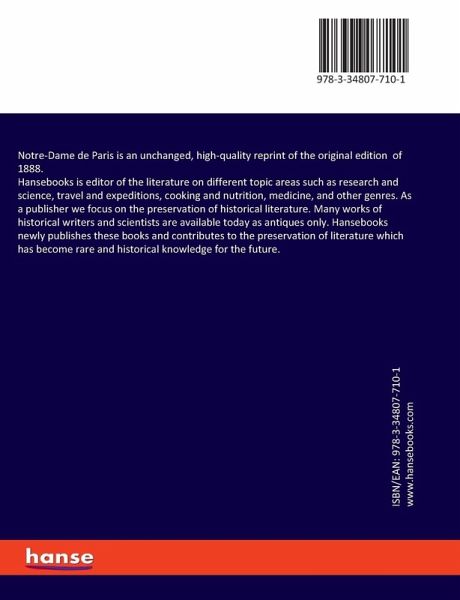 Notre-Dame de Paris is an unchanged, high-quality reprint of the original edition of 1888.Hansebooks is editor of the literature on different topic areas such as research and science, travel and expeditions, cooking and nutrition, medicine, and other genres. As a publisher we focus on the preservation of historical literature. Many works of historical writers and scientists are available today as antiques only. Hansebooks newly publishes these books and contributes to the preservation of literature which has become rare and historical knowledge for the future.