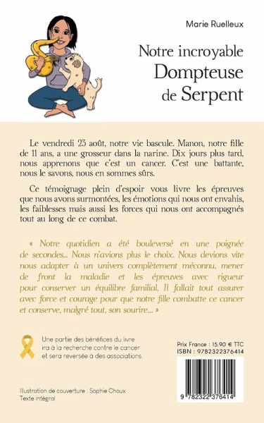 Le vendredi 23 août, notre vie bascule. Manon, notre fille de 11 ans, a une grosseur dans la narine. Dix jours plus tard, nous apprenons que c'est un cancer. C'est une battante, nous le savons, nous en sommes sûrs.Ce témoignage plein d'espoir vous livre les épreuves que nous avons surmontées, les émotions qui nous ont envahis, les faiblesses mais aussi les forces qui nous ont accompagnés tout au long de ce combat."Notre quotidien a été bouleversé en une poignée de secondes... Nous n'avions plus le choix. Nous devions vite nous adapter à un univers complètement méconnu, mener de front la maladie et les épreuves avec rigueur pour conserver un équilibre familial. Il fallait tout assurer avec force et courage pour que notre fille combatte ce cancer et conserve, malgré tout, son sourire..."Une partie des bénéfices du livre ira à la recherche contre le cancer et sera reversée à des associations.