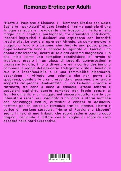 "Notte di Passione a Lisbona. 1 - Romanzo Erotico con Sesso Esplicito - per Adulti" di Lara Steele è il primo capitolo di una trilogia sensuale e travolgente che trasporta il lettore nella magia della capitale portoghese, tra atmosfere sofisticate, incontri imprevisti e desideri che esplodono con intensità irresistibile. La storia si apre con Alfredo, un uomo maturo in viaggio di lavoro a Lisbona, che durante una pausa pranzo apparentemente banale incrocia lo sguardo di Amalia, una donna affascinante, sicura di sé e dal carisma magnetico. Ciò che inizia come una semplice condivisione di tavolo si trasforma presto in un gioco di sguardi, conversazioni e promesse taciute, fino a diventare un incontro destinato a cambiare le regole del desiderio. L'eleganza virile di Amalia, il suo stile inconfondibile e la sua femminilità disarmante accendono in Alfredo una scintilla che non potrà più spegnersi, dando vita a un crescendo di passione, erotismo e scoperte reciproche. Ambientato in una Lisbona vibrante e raffinata, tra cene a lume di candela, attese febbrili e seduzioni esplicite, questo romanzo non lascia spazio ai fraintendimenti: è un viaggio nel piacere adulto, scritto con intensità e senza veli, dedicato a chi ama le storie erotiche con personaggi maturi, autentici e carichi di desiderio. Perfetto per chi cerca un romanzo erotico intenso, diretto e carico di tensione sessuale, "Notte di Passione a Lisbona" segna l'inizio di una trilogia che saprà sedurre pagina dopo pagina, lasciando il lettore con la voglia di scoprire cosa accadrà nelle notti successive.