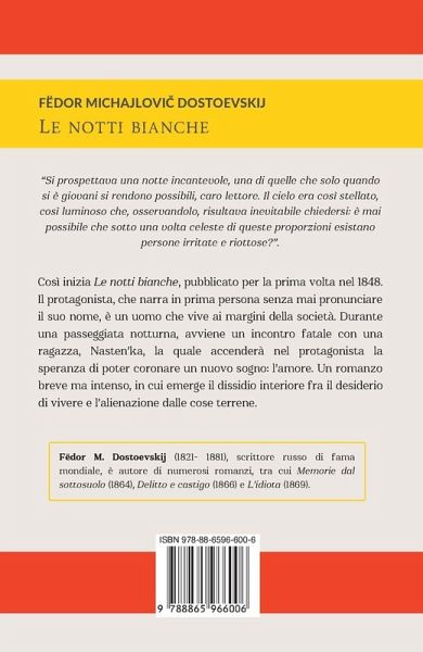 "Si prospettava una notte incantevole, una di quelle che solo quando si è giovani si rendono possibili, caro lettore. Il cielo era così stellato, così luminoso che, osservandolo, risultava inevitabile chiedersi: è mai possibile che sotto una volta celeste di queste proporzioni esistano persone irritate e riottose?". Così inizia Le notti bianche, pubblicato per la prima volta nel 1848. Il protagonista, che narra in prima persona senza mai pronunciare il suo nome, è un uomo che vive ai margini della società. Durante una passeggiata notturna, avviene un incontro fatale con una ragazza, Nasten'ka, la quale accenderà nel protagonista la speranza di poter coronare un nuovo sogno: l'amore. Un romanzo breve ma intenso, in cui emerge il dissidio interiore fra il desiderio di vivere e l'alienazione dalle cose terrene.
