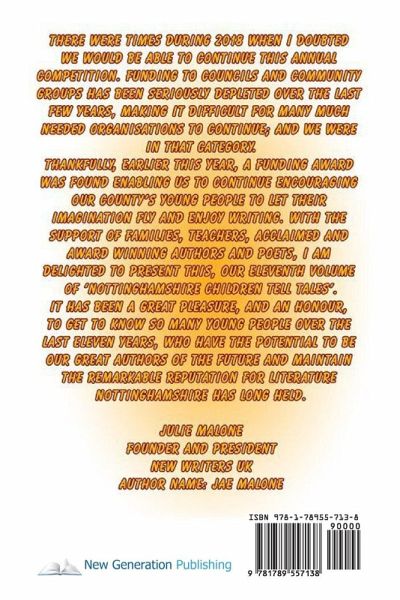 There were times during 2018 when I thought we would be able to continue this annual competition. Funding to councils and community groups has ben seriously depleted over the last few years, making it difficult for many much needed organisations to continue; and we were in that category. Thankfully, earlier this year, a funding award was found enabling us to continue encouring our county's young people to let their imagination fly and enjoy writing. With the support of families, teachers, acclaimed and award winning authors and poets, I am delighted to present this, our eleventh volume of 'Nottinghamshire Children Tell Tales'. It has been a great pleasure, and an honour, to get to know so many young people over the last eleven years, who have the potential to be our great authors of the future and maintain the remarkable reputation for literature Nottinghamshire has long held. - Julie Malone, Founder and President, New Writers UK