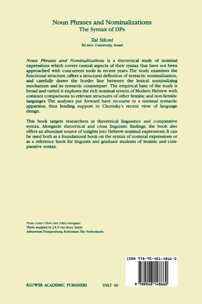 Noun Phrases and Nominalizations: The Syntax of DPs is a theoretical study of nominal expressions which covers central aspects of their syntax that have not been approached with concurrent tools in recent years. The study examines the functional structure, offers a structural definition of syntactic nominalization, and carefully draws the border line between the lexical nominalizing mechanism and its syntactic counterpart. The empirical base of the study is broad and varied: it explores the rich nominal system of Modern Hebrew with constant comparisons to relevant structures of other Semitic and non-Semitic languages. The analyses put forward have recourse to a minimal syntactic apparatus, thus lending support to Chomsky's recent view of language design.