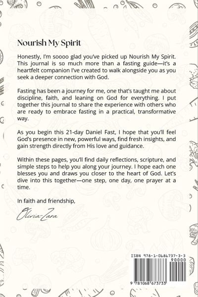 Honestly, I'm soooo glad you've picked up Nourish My Spirit. This journal is so much more than a fasting guide-it's a heartfelt companion I've created to walk alongside you as you seek a deeper connection with God. Fasting has been a journey for me, one that's taught me about discipline, faith, and leaning on God for everything. I put together this journal to share the experience with others who are ready to embrace fasting in a practical, transformative way. As you begin this 21-day Daniel Fast, I hope that you'll feel God's presence in new, powerful ways, find fresh insights, and gain strength directly from His love and guidance. Within these pages, you'll find daily reflections, scripture, and simple steps to help you along your journey. I hope each one blesses you and draws you closer to the heart of God. Let's dive into this together-one step, one day, one prayer at a time. In faith and friendship, Olivia-Zara