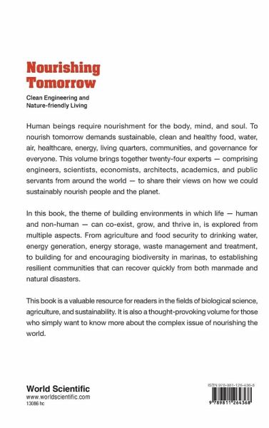 Human beings require nourishment for the body, mind, and soul. To nourish tomorrow demands sustainable, clean and healthy food, water, air, healthcare, energy, living quarters, communities, and governance for everyone. This volume brings together twenty-four experts - comprising engineers, scientists, economists, architects, academics, and public servants from around the world - to share their views on how we could sustainably nourish people and the planet. In this book, the theme of building environments in which life - human and non-human - can co-exist, grow, and thrive in, is explored from multiple aspects. From agriculture and food security to drinking water, energy generation, energy storage, waste management and treatment, to building for and encouraging biodiversity in marinas, to establishing resilient communities that can recover quickly from both manmade and natural disasters. This book is a valuable resource for readers in the fields of biological science, agriculture, and sustainability. It is also a thought-provoking volume for those who simply want to know more about the complex issue of nourishing the world.