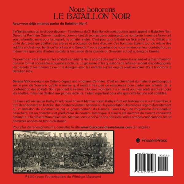 Serena Virk enseigne en Ontario depuis une vingtaine d'années. C'est en cherchant du matériel pédagogique sur le jour du Souvenir qu'elle a réalisé qu'il existait très peu de ressources pour parler aux enfants de la contribution des soldats Noirs pendant la Première Guerre mondiale. Il y en avait pour les adolescents et pour les adultes, mais rien destiné aux jeunes lecteurs. Il était important pour elle que cette lacune soit comblée. Le livre a été révisé par Kathy Grant, Sean Foyn et Mathias Joost. Kathy Grant est historienne et a été membre, à titre de spécialiste en histoire, du Comité consultatif national sur la présentation d'excuses à l'égard du traitement du 2e Bataillon de construction par le gouvernement du Canada. Sean Foyn, de l'organisme AfriCanadian Searchers, est un chercheur et producteur de contenu historique. Il a aussi été membre du Comité consultatif national sur la présentation d'excuses. Mathias Joost a servi 32 ans dans les Forces armées canadiennes, les 18 dernières années en tant qu'historien. Pour plus de renesignements, consultez le site www.blackcanadianveterans.com (en anglais)