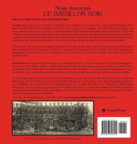 Serena Virk enseigne en Ontario depuis une vingtaine d'années. C'est en cherchant du matériel pédagogique sur le jour du Souvenir qu'elle a réalisé qu'il existait très peu de ressources pour parler aux enfants de la contribution des soldats Noirs pendant la Première Guerre mondiale. Il y en avait pour les adolescents et pour les adultes, mais rien destiné aux jeunes lecteurs. Il était important pour elle que cette lacune soit comblée. Le livre a été révisé par Kathy Grant, Sean Foyn et Mathias Joost. Kathy Grant est historienne et a été membre, à titre de spécialiste en histoire, du Comité consultatif national sur la présentation d'excuses à l'égard du traitement du 2e Bataillon de construction par le gouvernement du Canada. Sean Foyn, de l'organisme AfriCanadian Searchers, est un chercheur et producteur de contenu historique. Il a aussi été membre du Comité consultatif national sur la présentation d'excuses. Mathias Joost a servi 32 ans dans les Forces armées canadiennes, les 18 dernières années en tant qu'historien. Pour plus de renesignements, consultez le site www.blackcanadianveterans.com (en anglais)