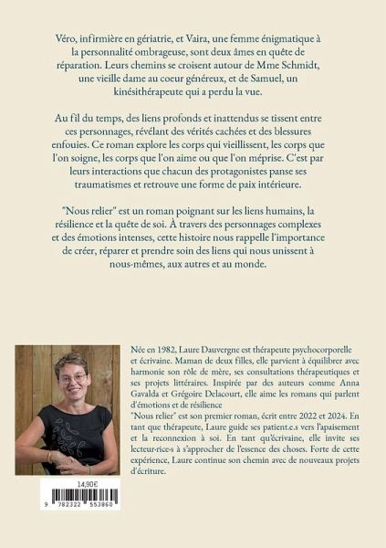 Véro, infirmière en gériatrie, et Vaira, une femme énigmatique à la personnalité ombrageuse, sont deux âmes en quête de réparation. Leurs chemins se croisent autour de Mme Schmidt, une vieille dame au coeur généreux, et de Samuel, un kinésithérapeute qui a perdu la vue. Au fil du temps, des liens profonds et inattendus se tissent entre ces personnages, révélant des vérités cachées et des blessures enfouies. Ce roman explore les corps qui vieillissent, les corps que l'on soigne, les corps que l'on aime ou que l'on méprise. C'est par leurs interactions que chacun des protagonistes panse ses traumatismes et retrouve une forme de paix intérieure. "Nous relier" est un roman poignant sur les liens humains, la résilience et la quête de soi. À travers des personnages complexes et des émotions intenses, cette histoire nous rappelle l'importance de créer, réparer et prendre soin des liens qui nous unissent à nous-mêmes, aux autres et au monde.