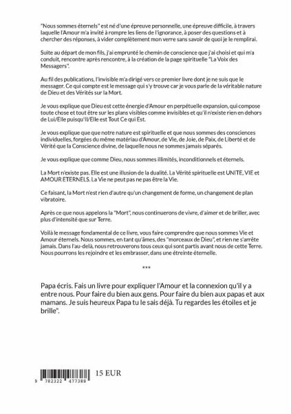 "Nous sommes éternels" est né d'une épreuve personnelle, une épreuve difficile, à travers laquelle l'Amour m'a invité à rompre les liens de l'ignorance, à poser des questions et à chercher des réponses, à vider complètement mon verre sans savoir de quoi je le remplirai. Suite au départ de mon fils, j'ai emprunté le chemin de conscience que j'ai choisi et qui m'a conduit, rencontre après rencontre, à la création de la page spirituelle "La Voix des Messagers". Au fil des publications, l'invisible m'a dirigé vers ce premier livre dont je ne suis que le messager. Ce qui compte est le message qui s'y trouve car je vous parle de la véritable nature de Dieu et des Vérités sur la Mort. Je vous explique que Dieu est cette énergie d'Amour en perpétuelle expansion, qui compose toute chose et tout être sur les plans visibles comme invisibles et qu'il n'existe rien en dehors de Lui/Elle puisqu'Il/Elle est Tout Ce qui Est. Je vous explique que notre nature est spirituelle et que nous sommes des consciences individuelles, forgées du même matériau d'Amour, de Vie, de Joie, de Paix, de Liberté et de Vérité que la Conscience divine, de laquelle nous ne sommes jamais séparés. Je vous explique que comme Dieu, nous sommes illimités, inconditionnels et éternels. La Mort n'existe pas. Elle est une illusion de la dualité. La Vérité spirituelle est UNITE, VIE et AMOUR ETERNELS. La Vie ne peut pas ne pas être la Vie. Ce faisant, la Mort n'est rien d'autre qu'un changement de forme, un changement de plan vibratoire. Après ce que nous appelons la "Mort", nous continuerons de vivre, d'aimer et de briller, avec plus d'intensité que sur Terre. Voilà le message fondamental de ce livre, vous faire comprendre que nous sommes Vie et Amour éternels. Nous sommes, en tant qu'âmes, des "morceaux de Dieu", et rien ne s'arrête jamais. Dans l'au-delà, nous retrouverons tous ceux qui sont partis avant nous de cette Terre. Nous pourrons les rejoindre et les embrasser, dans une étreinte éternelle. *** « Papa écris ! Fais un livre pour expliquer l'Amour et la connexion qu'il y a entre nous. Pour faire du bien aux gens. Pour faire du bien aux papas et aux mamans. Je suis heureux Papa tu le sais déjà. Tu regardes les étoiles et je brille ».