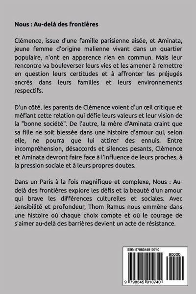 Dans un Paris moderne et cosmopolite, deux femmes que tout oppose vont s'aimer envers et contre tout. Clémence, issue d'une famille aisée et habituée au confort de sa vie privilégiée, rencontre Aminata, une femme d'origine malienne au parcours difficile, profondément ancrée dans sa culture et ses racines. Leur amour naissant les pousse à affronter les barrières invisibles de leurs milieux respectifs, les préjugés de leurs familles et les pressions de la société. Au fil des pages, Nous: Au-delà des frontières explore la puissance de l'amour face aux différences culturelles, raciales et sociales. Avec une plume sensible et engagée, Thom Ramus nous offre une histoire inspirante sur l'acceptation, la résilience et la quête d'authenticité. Un roman captivant qui célèbre la diversité, la force du coeur et le courage de vivre sa vérité dans un monde qui divise. Parfait pour les lecteurs qui cherchent une histoire d'amour sincère et moderne, où les différences deviennent des ponts vers un avenir commun.