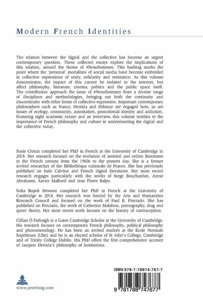 The relation between the digital and the collective has become an urgent contemporary question. These collected essays explore the implications of this relation, around the theme of #NousSommes. This hashtag marks the point where the "personal" modalities of social media have become embroiled in collective expressions of unity, solidarity and resistance. As this volume demonstrates, the impact of this cannot be isolated to the internet, but affect philosophy, literature, cinema, politics and the public space itself. The contributors approach the issue of #NousSommes from a diverse range of disciplines and methodologies, bringing out both the continuity and discontinuity with other forms of collective expression. Important contemporary philosophers such as Nancy, Derrida and Deleuze are engaged here, as are issues of ecology, community, automation, postcolonial identity and addiction. Featuring eight academic essays and an interview, this volume testifies to the importance of French philosophy and culture in understanding the digital and the collective today.
