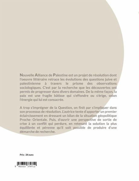 Nouvelle Alliance de Palestine est un projet de résolution dont l'oeuvre littéraire retrace les évolutions des questions juive et palestinienne à travers le prisme des observations sociologiques. C'est par la recherche que les découvertes ont permis de progresser dans divers domaines. De la même façon, la paix est une fragile bâtisse qui s'effondre ou s'érige, selon l'énergie qui lui est consacrée.A trop s'imprégner de la Question, on finit par s'impliquer dans son processus de résolution. L'autrice tente d'apporter un premier éclaircissement en dressant un bilan de la situation géopolitique Proche-Orientale. Puis, d'ouvrir une perspective de sortie de crise à un conflit qui perdure, en retenant la solution la plus équilibrée et pérenne qu'il soit possible de produire d'une démarche de recherche.