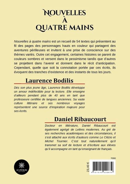 Nouvelles à quatre mains est un recueil de 54 textes qui présentent au fil des pages des personnages hauts en couleur qui partagent des aventures périlleuses et invitent à une prise de conscience sur des thèmes variés. Outre cet engagement, certaines histoires se parent de couleurs sombres et versent dans le pessimisme tandis que d¿autres se projettent dans l¿avenir et donnent dans le récit d¿anticipation. Cependant, quelle que soit la connotation portée par ces écrits, ils évoquent des tranches d¿existence et des instants de tous les jours.