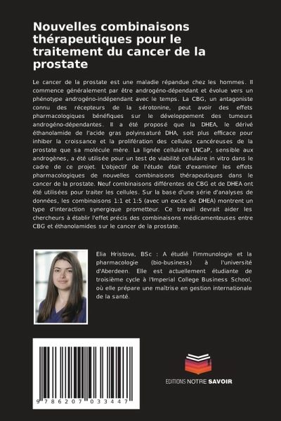 Le cancer de la prostate est une maladie répandue chez les hommes. Il commence généralement par être androgéno-dépendant et évolue vers un phénotype androgéno-indépendant avec le temps. La CBG, un antagoniste connu des récepteurs de la sérotonine, peut avoir des effets pharmacologiques bénéfiques sur le développement des tumeurs androgéno-dépendantes. Il a été proposé que la DHEA, le dérivé éthanolamide de l'acide gras polyinsaturé DHA, soit plus efficace pour inhiber la croissance et la prolifération des cellules cancéreuses de la prostate que sa molécule mère. La lignée cellulaire LNCaP, sensible aux androgènes, a été utilisée pour un test de viabilité cellulaire in vitro dans le cadre de ce projet. L'objectif de l'étude était d'examiner les effets pharmacologiques de nouvelles combinaisons thérapeutiques dans le cancer de la prostate. Neuf combinaisons différentes de CBG et de DHEA ont été utilisées pour traiter les cellules. Sur la base d'une série d'analyses de données, les combinaisons 1:1 et 1:5 (avec un excès de DHEA) montrent un type d'interaction synergique prometteur. Ce travail devrait aider les chercheurs à établir l'effet précis des combinaisons médicamenteuses entre CBG et éthanolamides sur le cancer de la prostate.