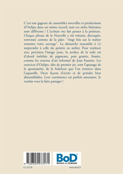 C'est une gageure de rassembler nouvelles et productions d'Oulipo dans un même recueil, tant ces styles littéraires sont différents ! L'écriture me fait penser à la peinture. Chaque phrase de la Nouvelle a été triturée, découpée, renversée comme de la pâte: "vingt fois sur le métier remettez votre ouvrage". La démarche ressemble à s'y méprendre à celle du peintre en atelier. Pour restituer avec précision l'image juste, la surface de la toile est d'abord imbibée de pigments puis grattée, frottée comme ces oeuvres d'art informel de Jean Fautrier. Les exercices d'Oulipo, dits de premier jet, sont l'apanage de la spontanéité, de la fraîcheur que l'on retrouve dans l'aquarelle. Deux façons d'écrire et de peindre bien dissemblables. Leur coexistence est parfois amusante. Je voulais vous la faire partager !