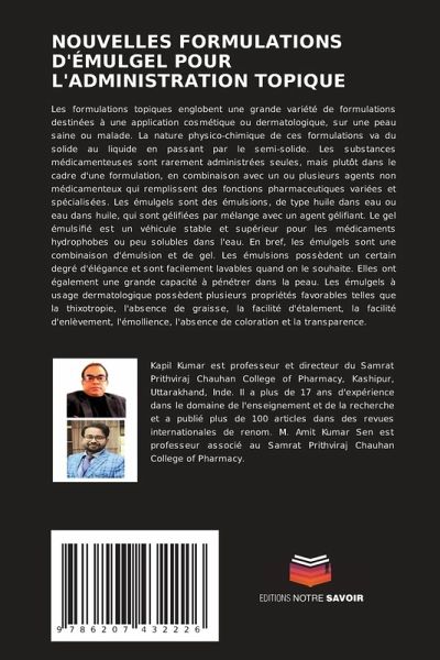 Les formulations topiques englobent une grande variété de formulations destinées à une application cosmétique ou dermatologique, sur une peau saine ou malade. La nature physico-chimique de ces formulations va du solide au liquide en passant par le semi-solide. Les substances médicamenteuses sont rarement administrées seules, mais plutôt dans le cadre d'une formulation, en combinaison avec un ou plusieurs agents non médicamenteux qui remplissent des fonctions pharmaceutiques variées et spécialisées. Les émulgels sont des émulsions, de type huile dans eau ou eau dans huile, qui sont gélifiées par mélange avec un agent gélifiant. Le gel émulsifié est un véhicule stable et supérieur pour les médicaments hydrophobes ou peu solubles dans l'eau. En bref, les émulgels sont une combinaison d'émulsion et de gel. Les émulsions possèdent un certain degré d'élégance et sont facilement lavables quand on le souhaite. Elles ont également une grande capacité à pénétrer dans la peau. Les émulgels à usage dermatologique possèdent plusieurs propriétés favorables telles que la thixotropie, l'absence de graisse, la facilité d'étalement, la facilité d'enlèvement, l'émollience, l'absence de coloration et la transparence.